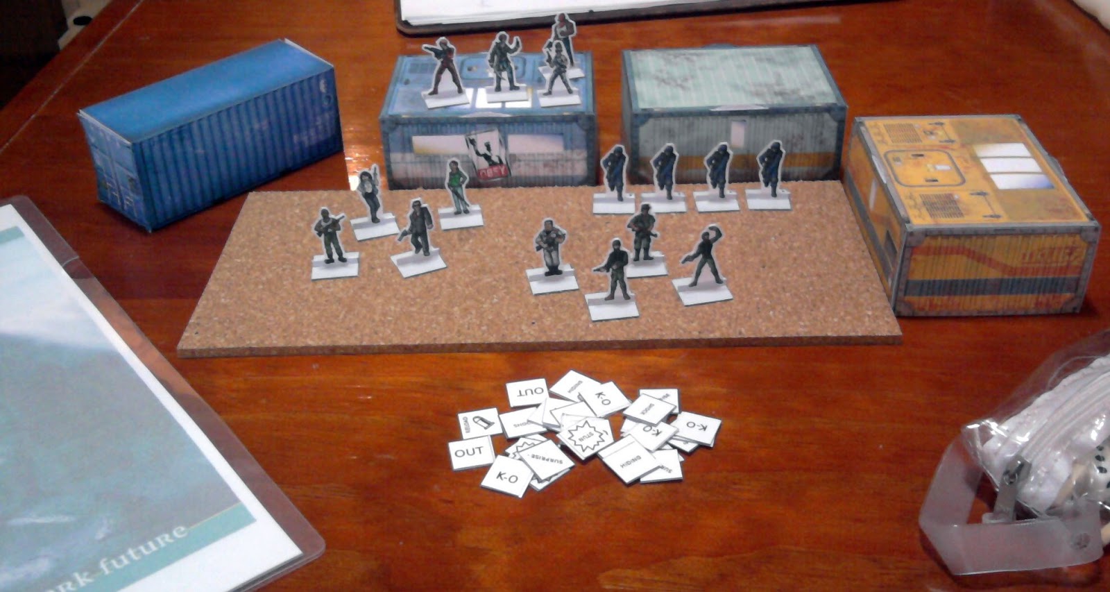 The basic book comes with a set of paper miniatures from their "Disposable Heroes" series. I was a little annoyed by the fact that they are meant to be assembled into "A-frames" that are about 18x15mm on the base, so I fired up the Gimp, scaled the minis to be 20mm wide and added an integral 20x20mm square base. Some cutting later, the result was this (shown along some of the excellent Ikubes and ISO container from TopoSolitario):
